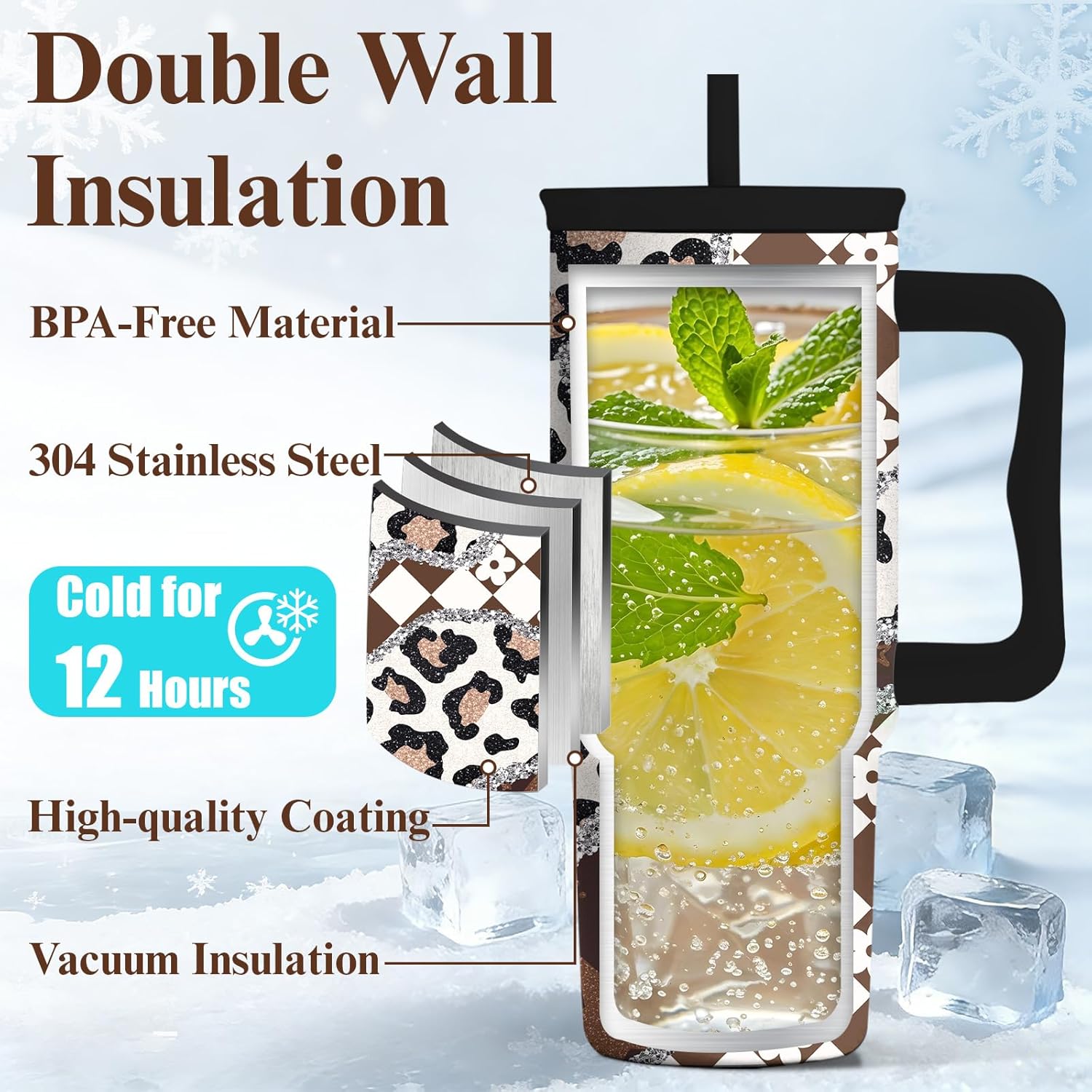 Features: Leopard/Animal Print 40oz Capacity Handle & Straw Insulated Spill-Proof Easy to Clean